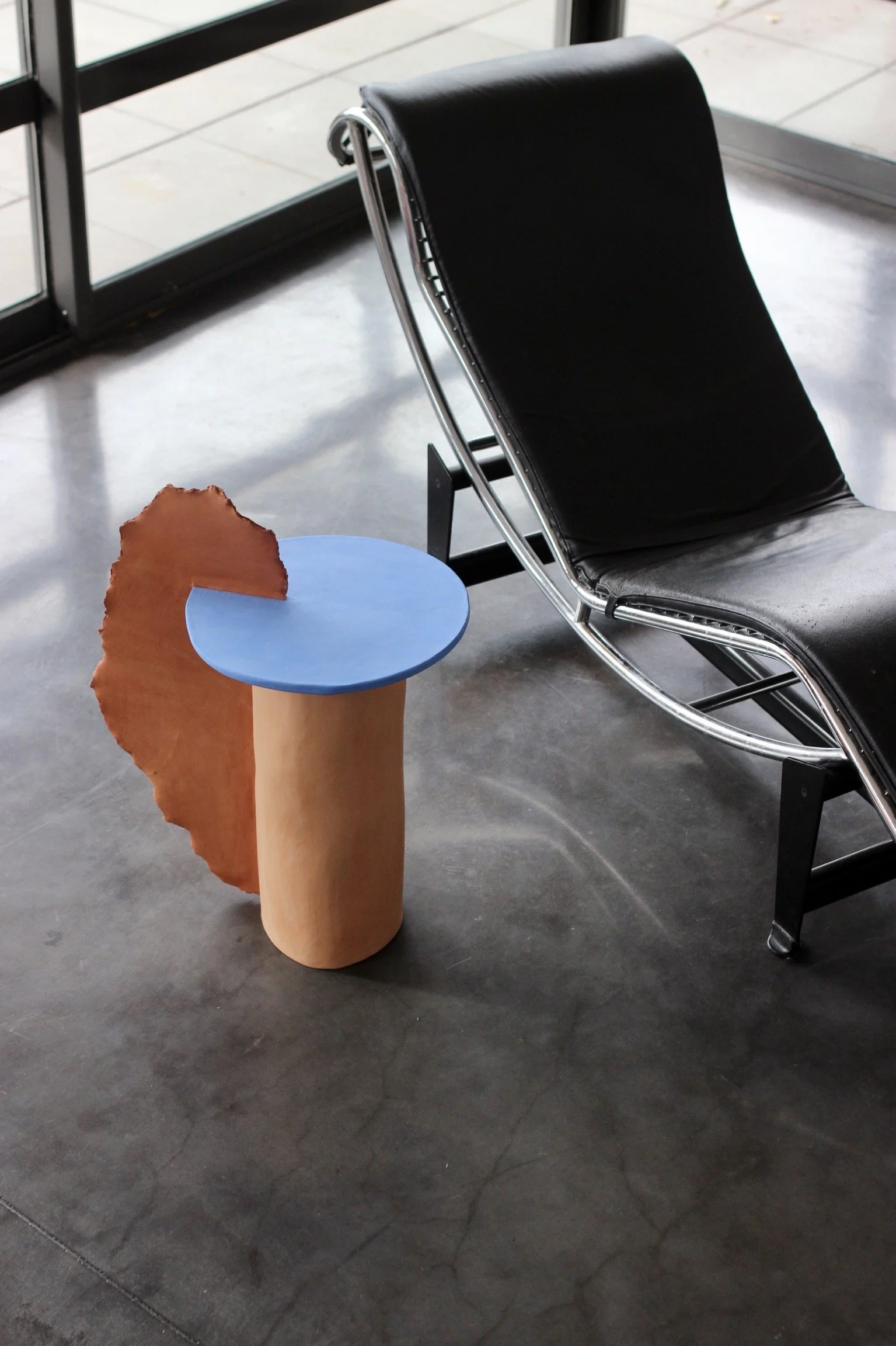 Pièce unique. Fait à la main. Modelage. Faïence rose et rouge. Engobe bleu.