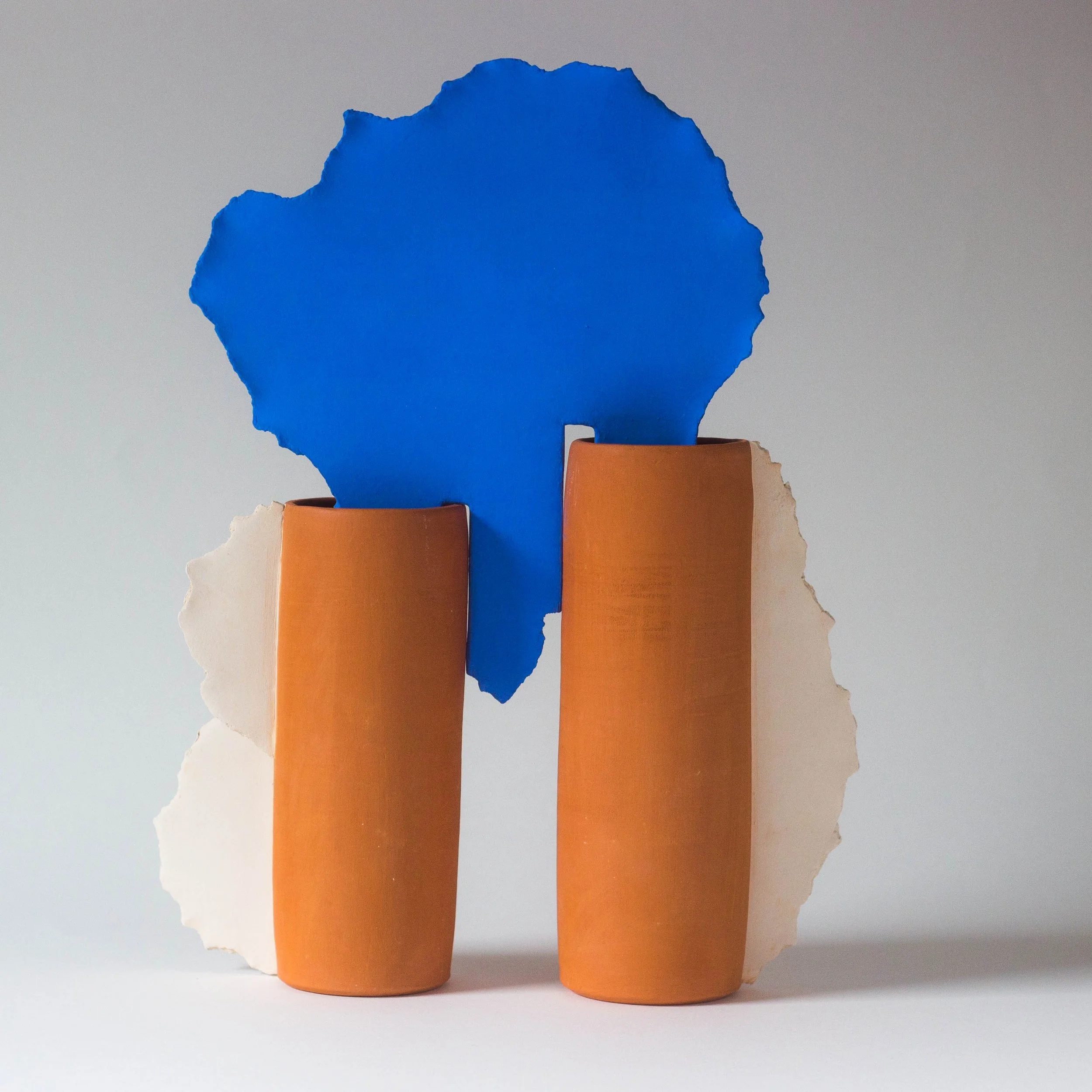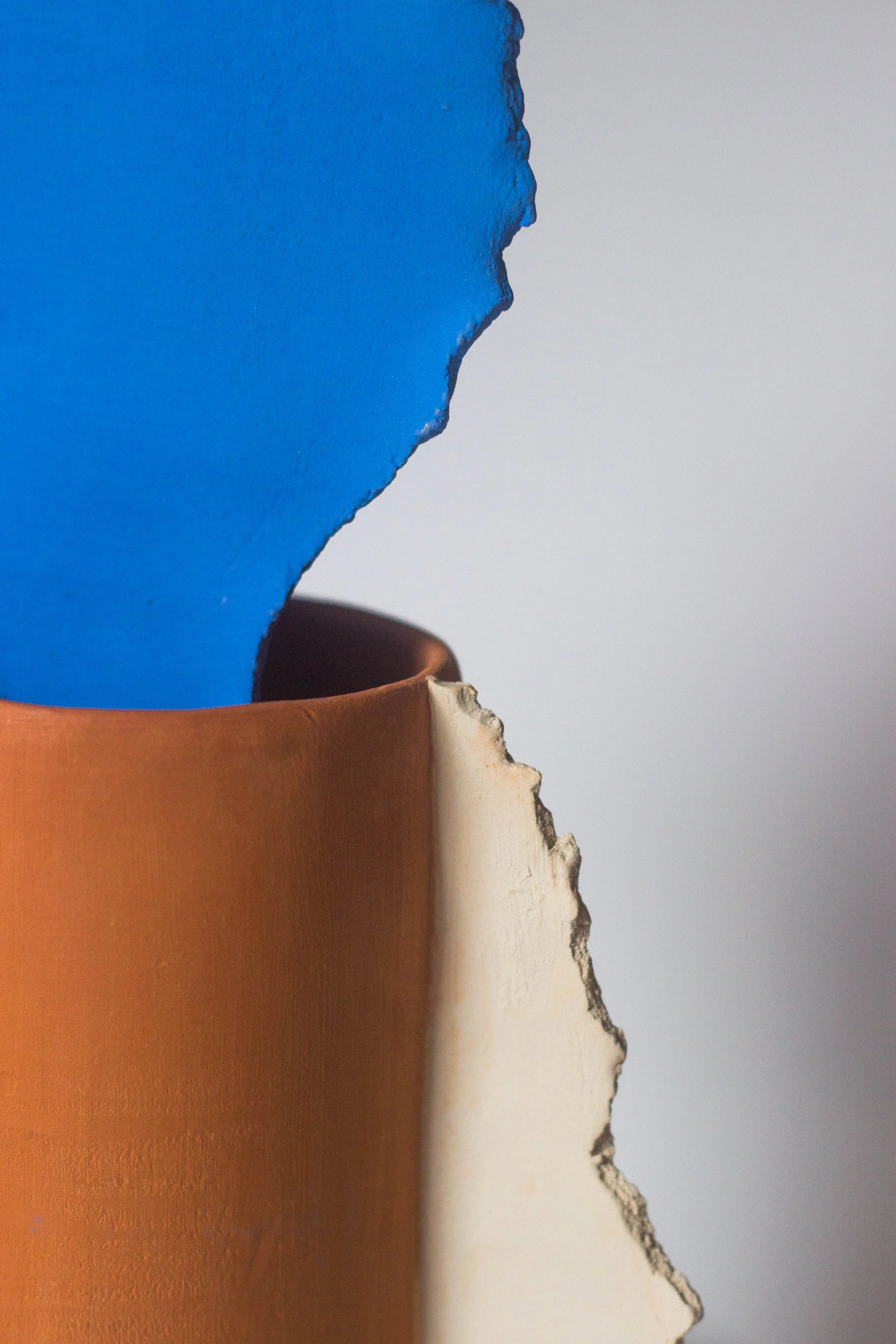 Pièces uniques. Fait à la main. Tournage et modelage. Faïence blanche et rouge. Engobe bleu.